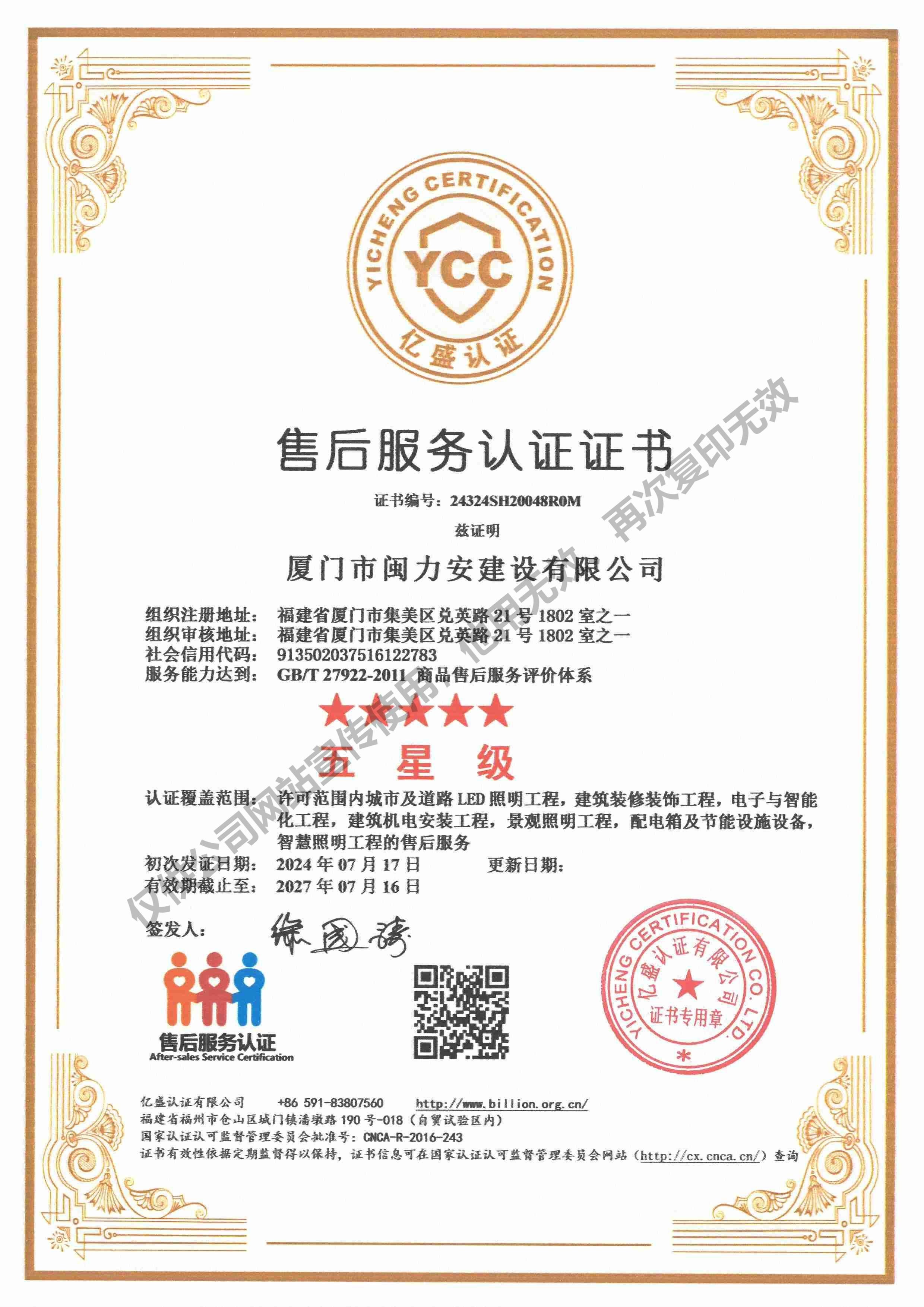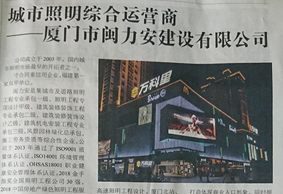 廈門市閩力安建設(shè)有限公司成立于2003年,公司取得市政公用工程施工總承包貳級、建筑裝修裝飾工程專業(yè)承包壹級、城市及道路照明工程專業(yè)承包壹級、電子與智能化工程專業(yè)承包貳級、消防設(shè)施工程專業(yè)承包貳級、電力工程施工總承包叁級、建筑機(jī)電安裝工程專業(yè)承包叁級、輸變電工程專業(yè)承包叁級、環(huán)保工程專業(yè)承包叁級、照明工程設(shè)計專項(xiàng)甲級、建筑裝飾工程設(shè)計乙級、施工勞務(wù)等資質(zhì)的綜合型企業(yè),公司于2013年通過了ISO9001質(zhì)量體系認(rèn)證,ISO14001環(huán)境管理體系認(rèn)證,OHSAS18001職業(yè)健康安全管理體系認(rèn)證。